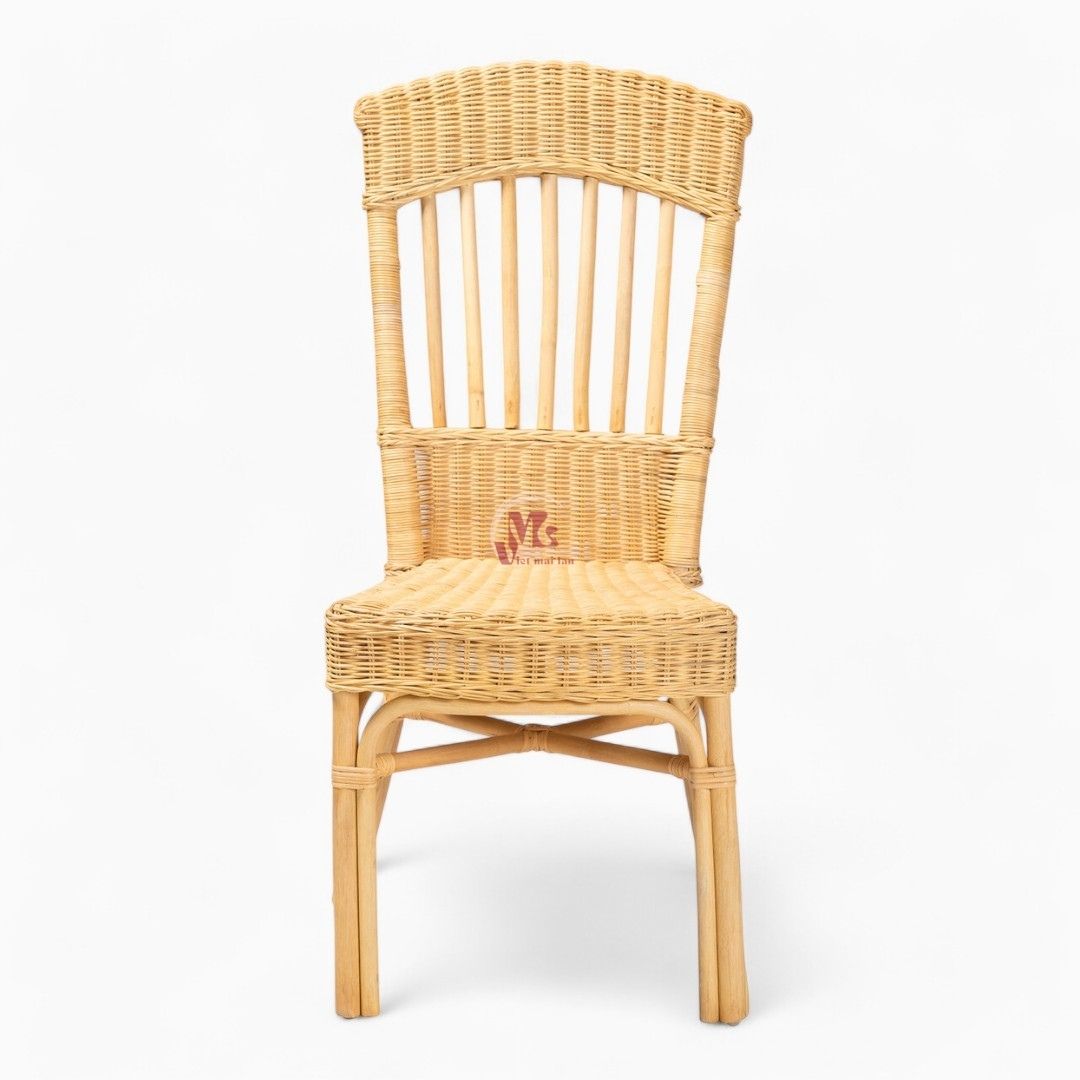 - Its rounded backrest and seat lend a smooth silhouette, while slim rattan rods form a smooth embrace. It features a varnished finish, giving the piece undeniable wear resistance. Moreover, the natural finish highlights the beauty of the wicker, creating a warm, informal look that enhances any dining setting.