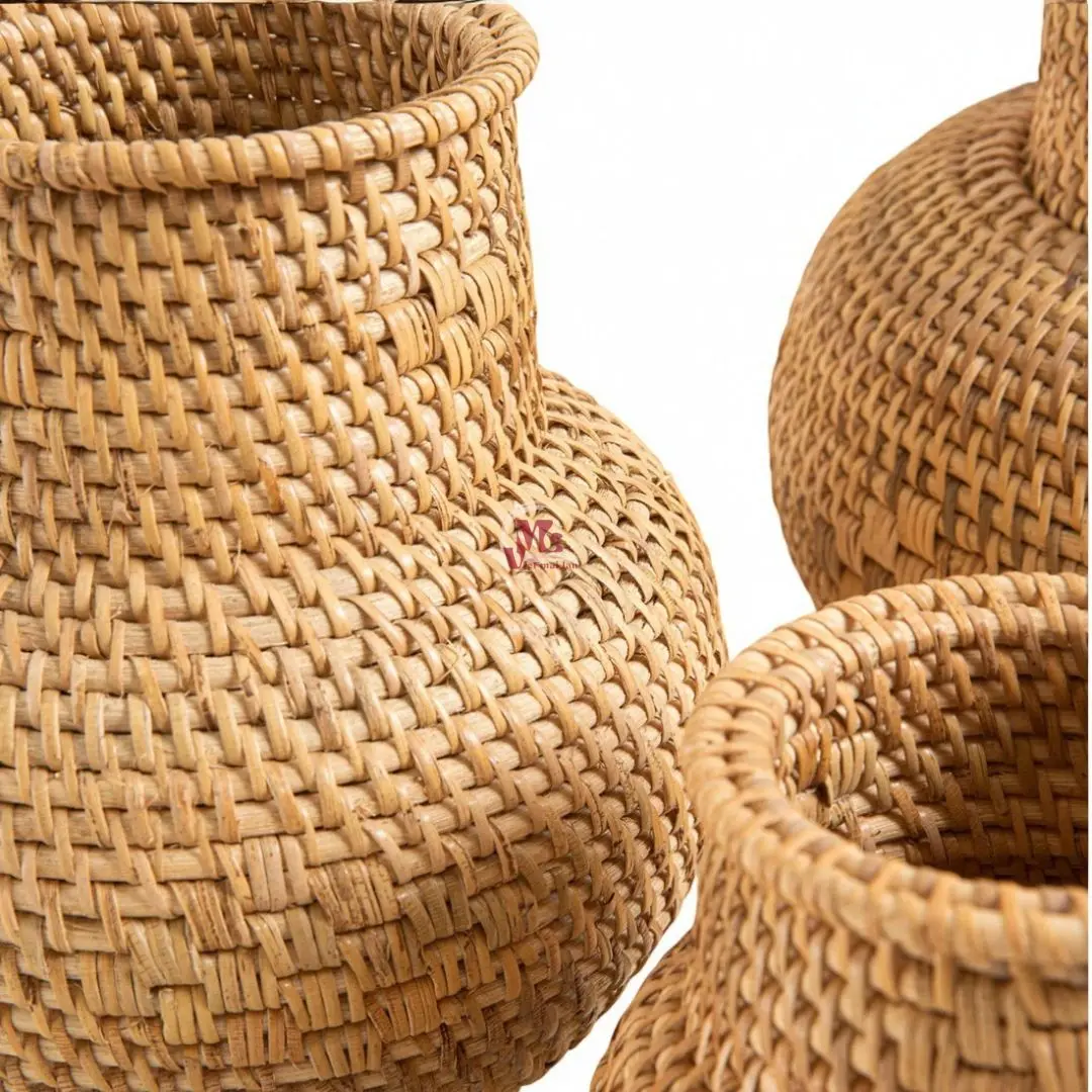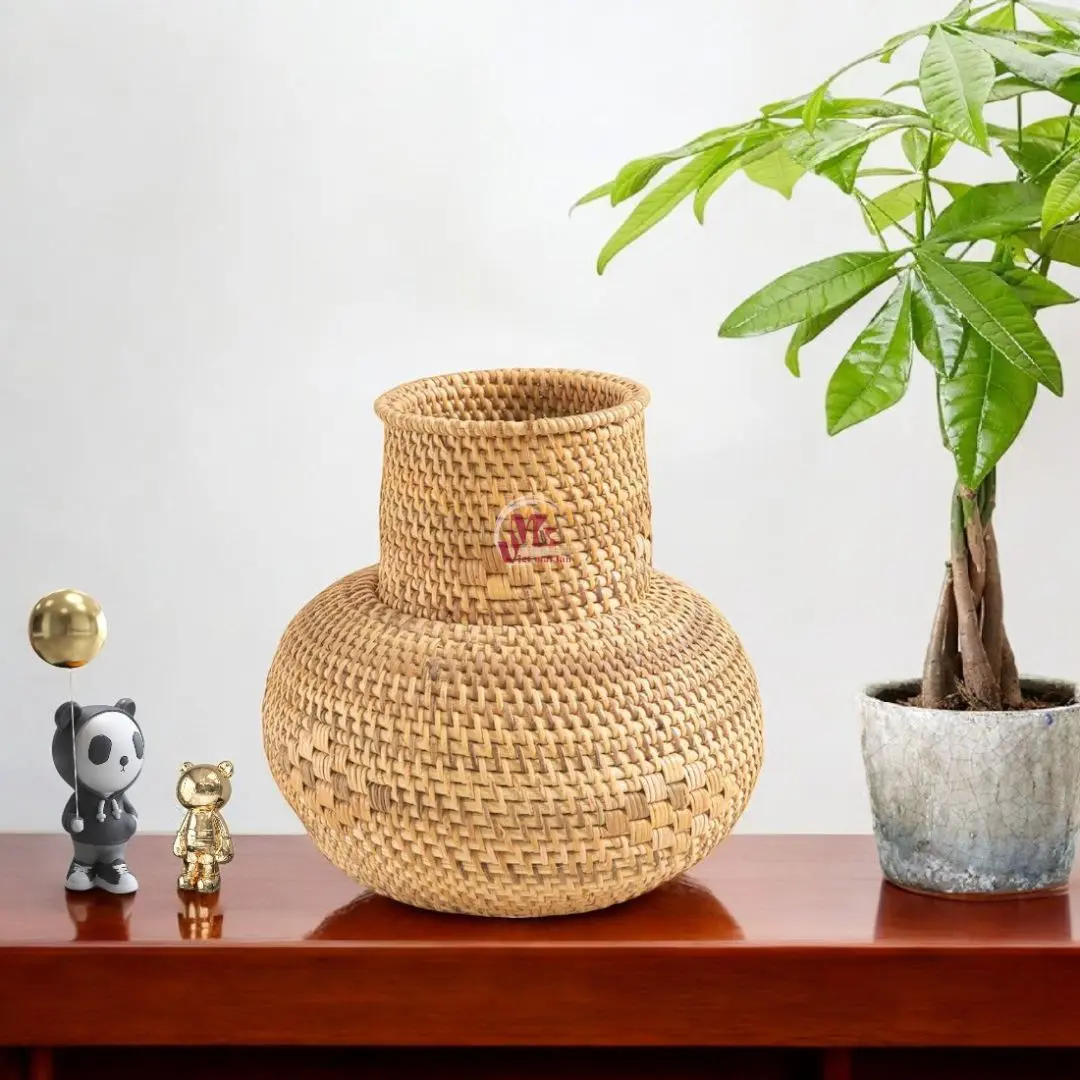 This vase is a decorative item made from rattan. Due to its natural material, each rattan natural vase may have slight variations in color and texture.