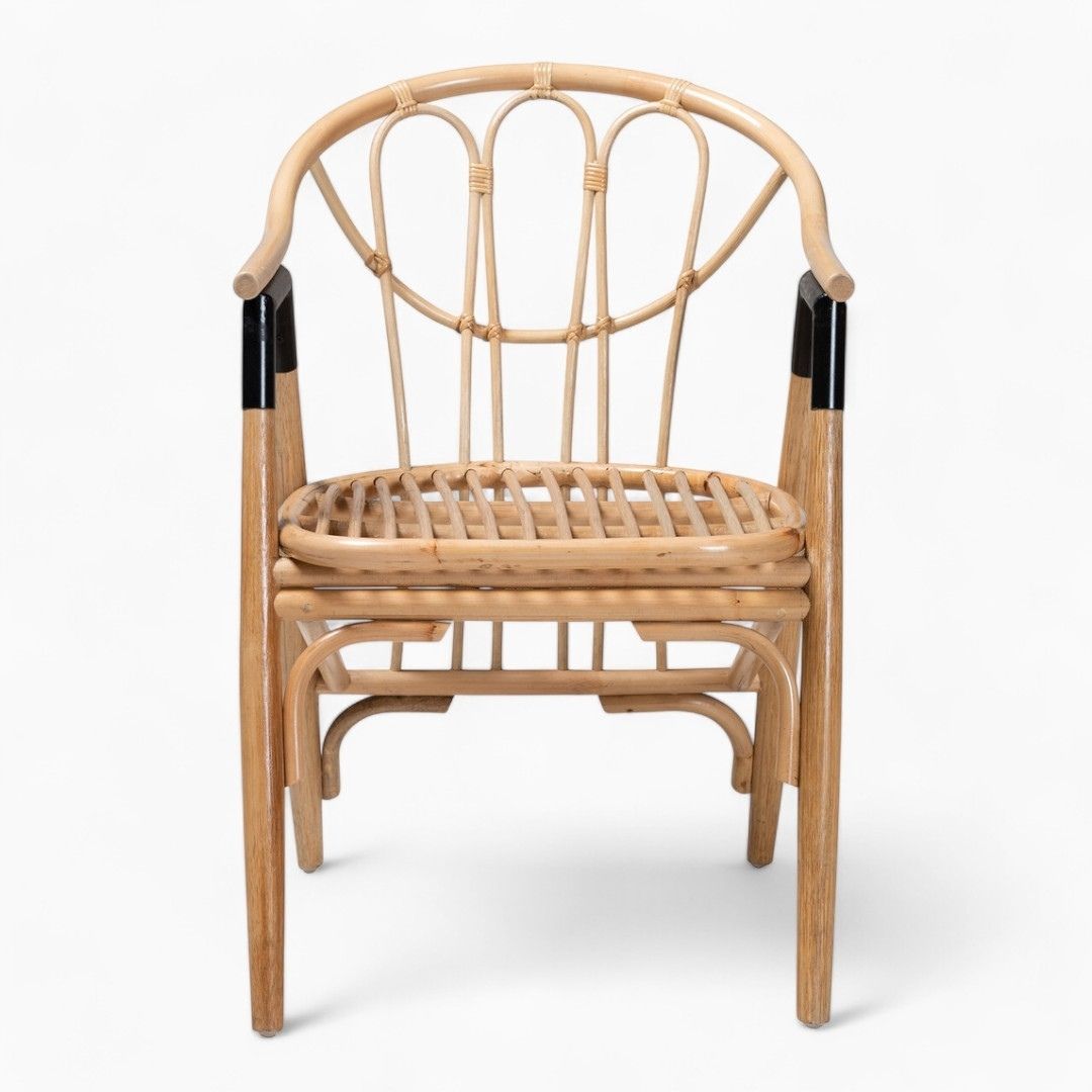 - Its rounded backrest and seat lend a smooth silhouette, while slim rattan rods form a smooth embrace. It features a varnished finish, giving the piece undeniable wear resistance. Moreover, the natural finish highlights the beauty of the wicker, creating a warm, informal look that enhances any dining setting.