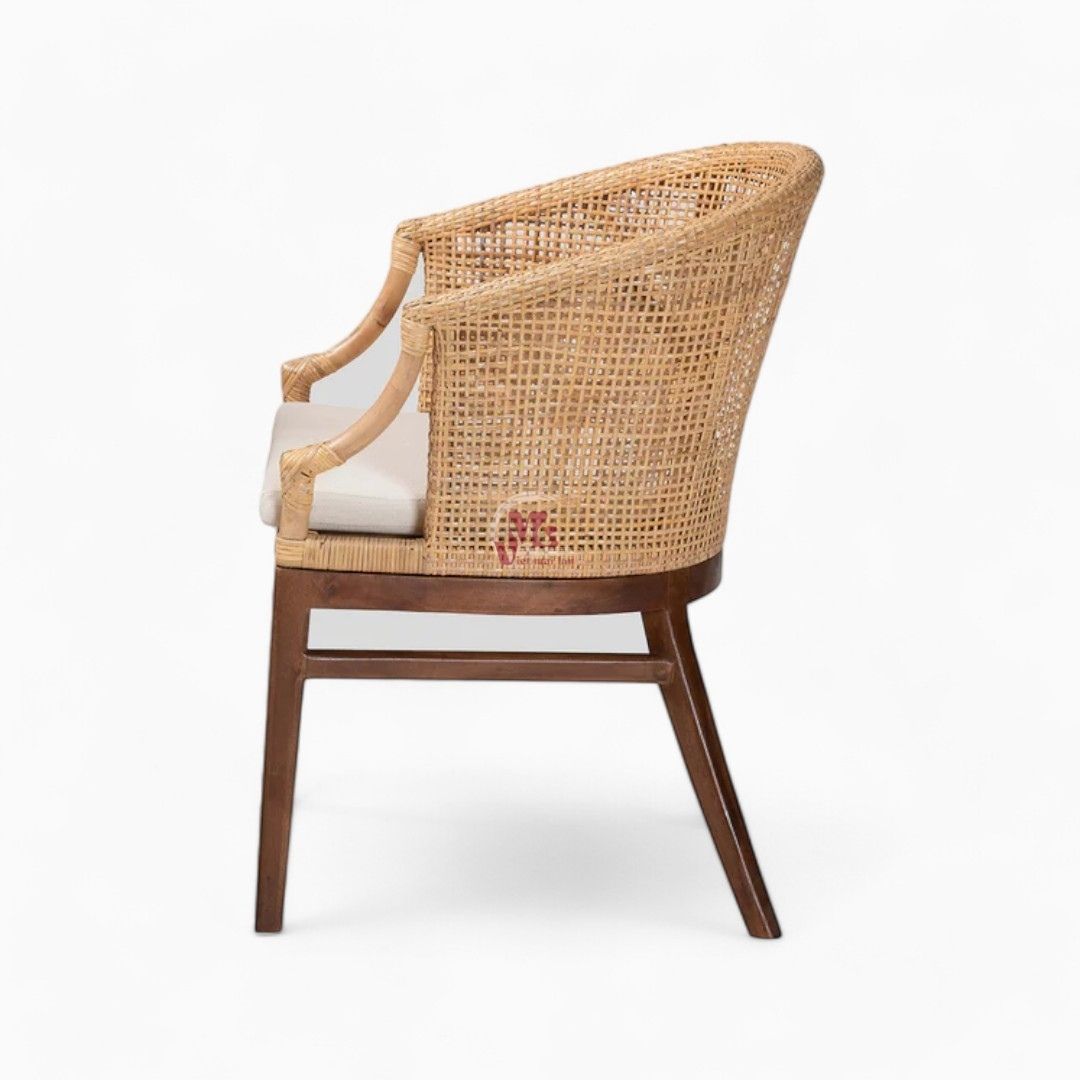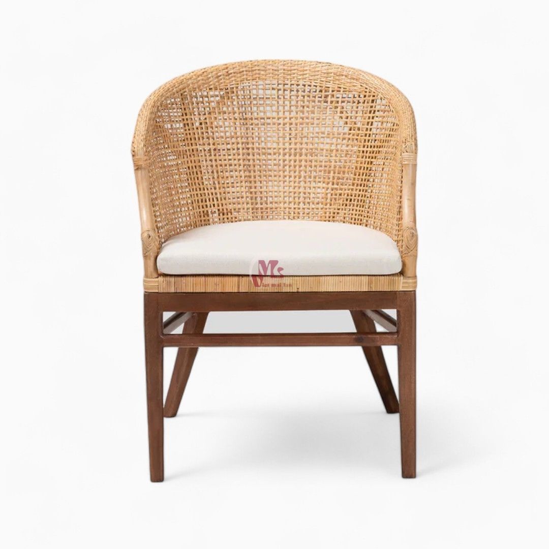 - Its rounded backrest and seat lend a smooth silhouette, while slim rattan rods form a smooth embrace. It features a varnished finish, giving the piece undeniable wear resistance. Moreover, the natural finish highlights the beauty of the wicker, creating a warm, informal look that enhances any dining setting.